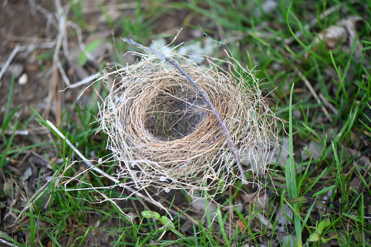 The fading light reveals an abandoned bird’s nest in the grass