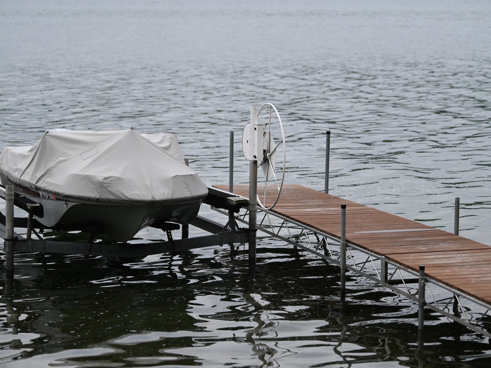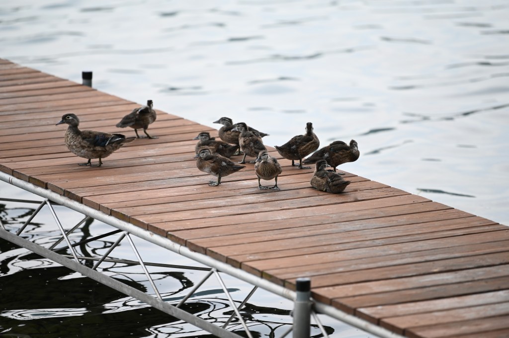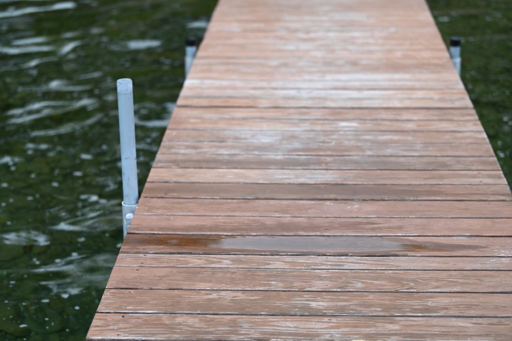 The planks on the dock are soaked with last night’s rain