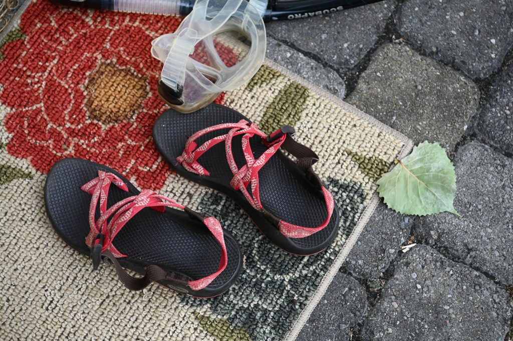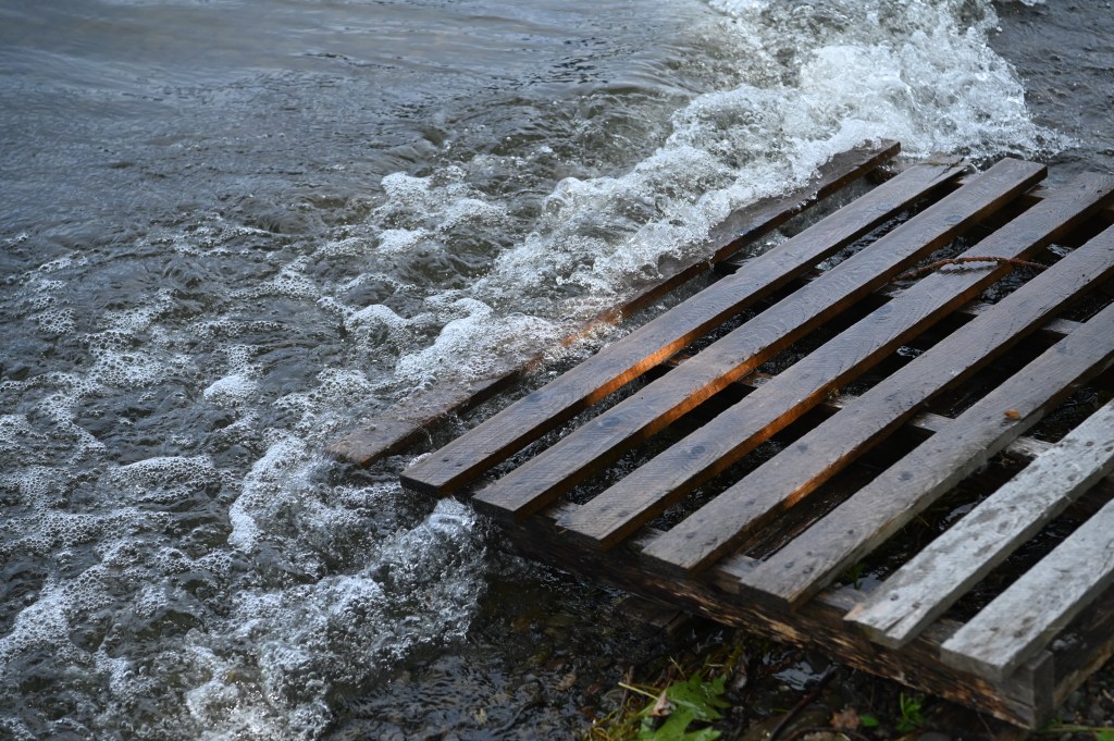 The beads of water glisten on the dock