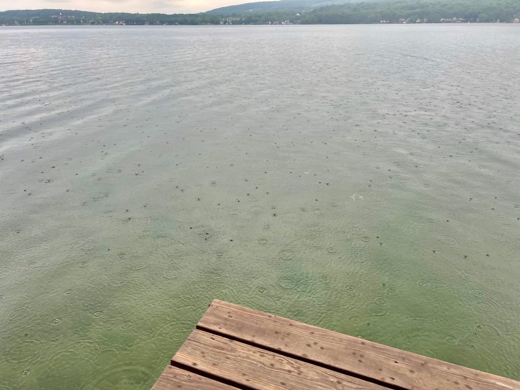 I notice the rain making little circles in the water