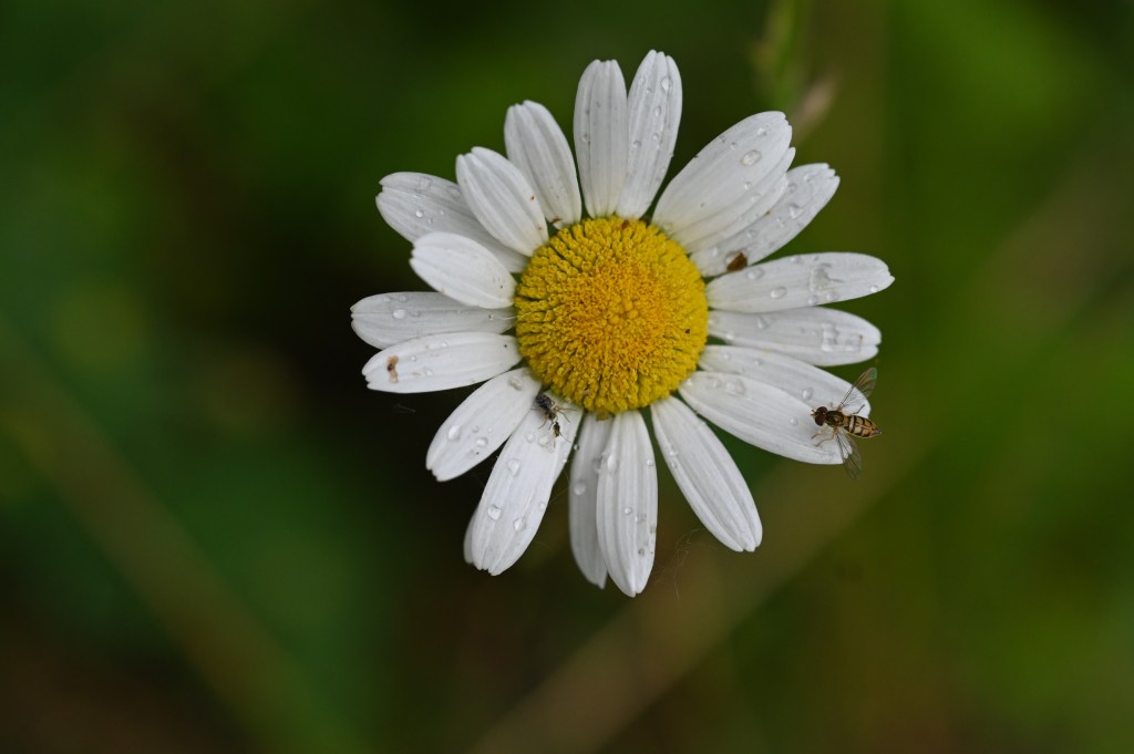A tiny sweat bee landing on a daisy