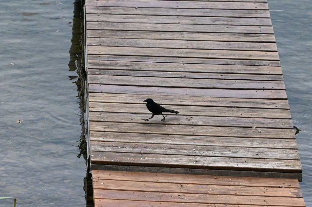 A black bird landed on the dock
